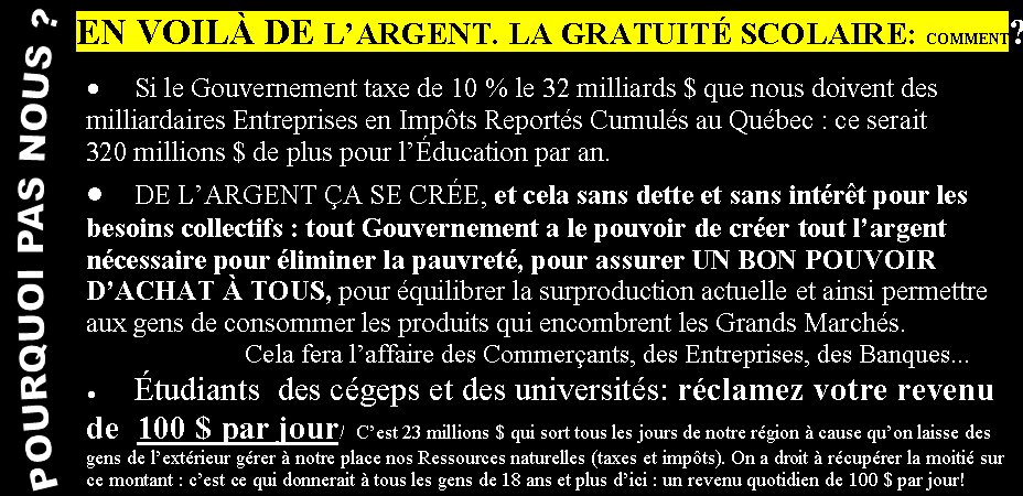 L’État est en dette envers nous! Pour avoir parvenu à l’université, le travailleur ‘’étudiant’’ a déjà donné à sa société plus de 17 000 heures d’études et de travail. 17 000 heures de contributions à sa société: efforts qui doivent être récompensés par ce montant que le Gouvernement doit donner à chacun à ses 18 ans : 136 000 $ (17 000 X 8 $/hrs= 136 000$). Nous ne sommes pas des esclaves à éduquer sans revenus. C’est ça protéger ‘’l'AVENIR’’